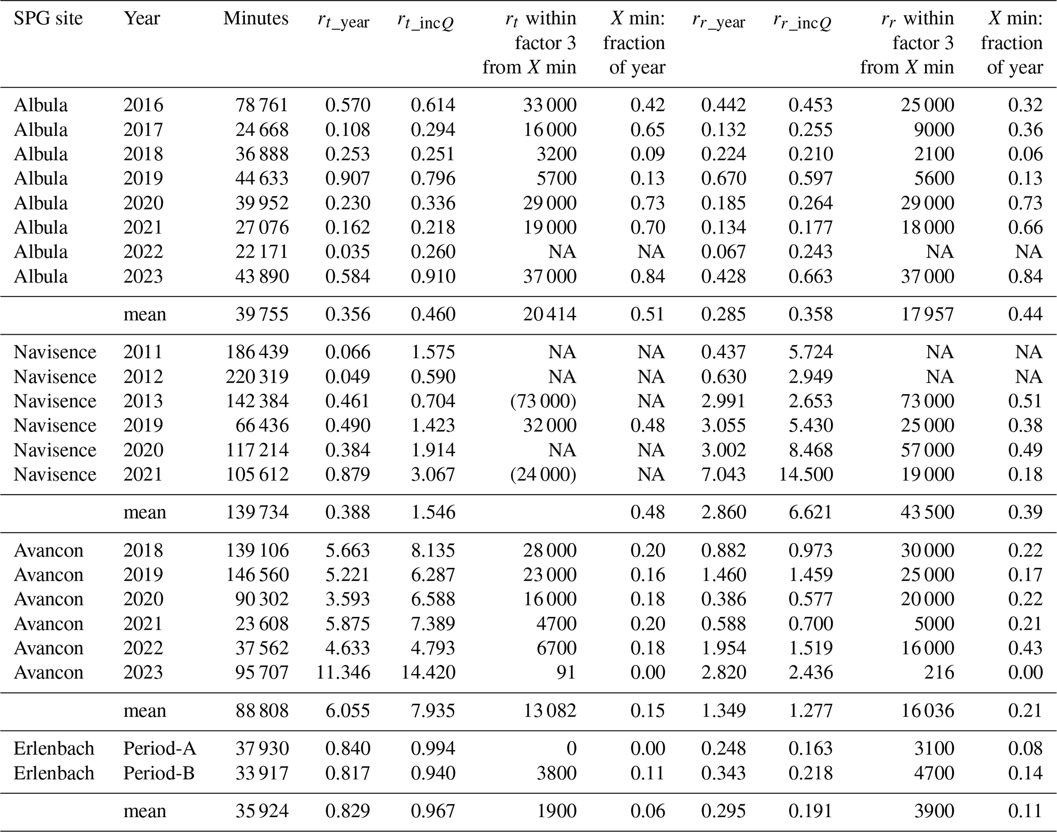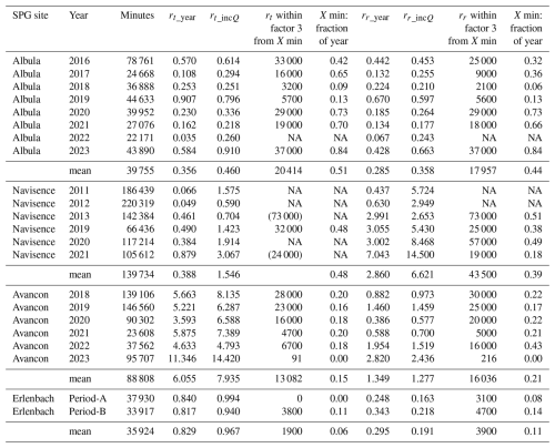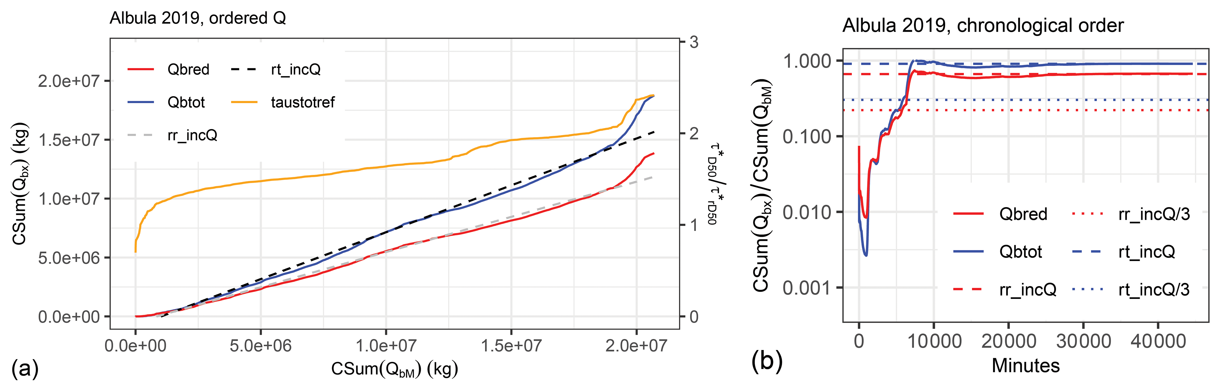 Annual ratios of calculated to observed bedload masses were determined based on observations over several years. For a given year this analysis was based on total durations with bedload transport, which ranged from about 30 000 to 150 000 min (only two years for the Navisence include longer durations). The main quantitative results of this analysis are summarized for all four Swiss streams in Appendix C including Table C1, while some additional information is given separately for each stream in the Supplement (Tables S2, S3, S4, S5). The results of the analysis reported in Appendix C allowed to derive the approximate duration from the beginning of the transport season to the time point after which the rx_chron values were within about a factor of 3 above or below the rx_incQ values, x = t or r. Although there is quite some variability from year to year, the average relative duration, in terms of a fraction of the total transport duration of a year, was as follows (first number refers to the x = t and the second number to the x = r analysis): 51 % and 44 % for the Albula, 48 % and 39 % for the Navisence, 15 % and 21 % for the Avançon, and 6 % and 11 % for the Erlenbach (Table C1).