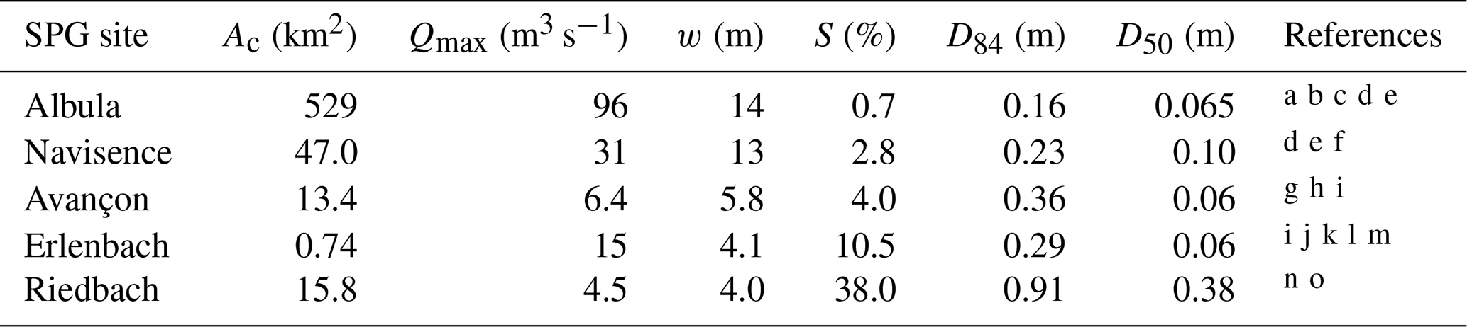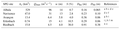 Table 1Characteristics of Swiss field sites with SPG measurements. Ac = catchment area, Qmax = maximum discharge for the observation year, w = channel width, S = channel slope, Dxx = characteristic grain size (see also text and Appendix E).