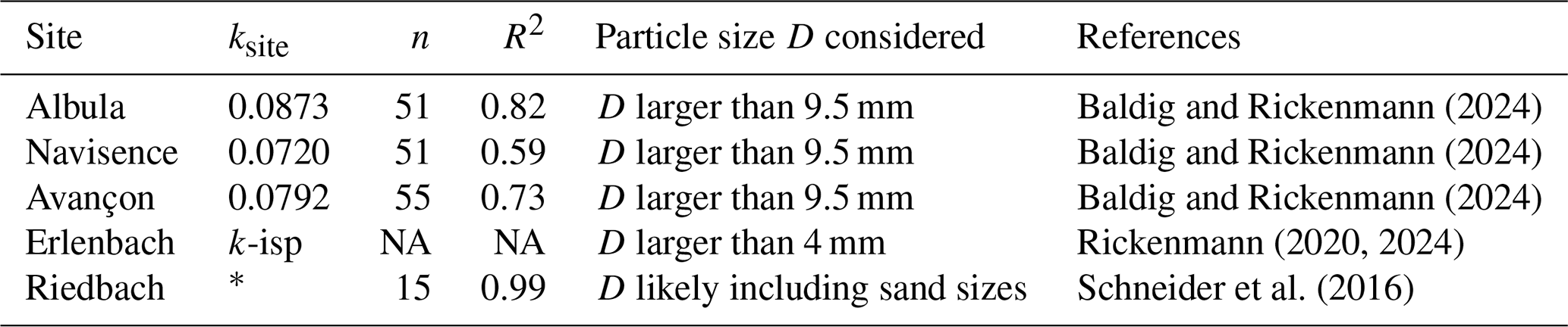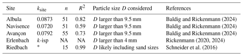 At four sites (Navisence, Avançon, Erlenbach, and Riedbach) discharge measurements of Q (in m3 s−1) were available at the location of the SPG measurements (see references in Table 1). At the Albula river in Tiefencastel, a runoff gauging station is located a few hundred meters downstream of the SPG site. These discharge data were corrected for bypassed water used by a hydropower company and returned to the river in the reach in-between the two sites (Rickenmann et al., 2017).