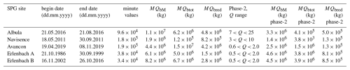 Table 2Calibration coefficients and equations used for the different SPG sites. The calibration coefficient k-isp for the Erlenbach refers to individual survey periods of the sediment deposits in the retention basin.