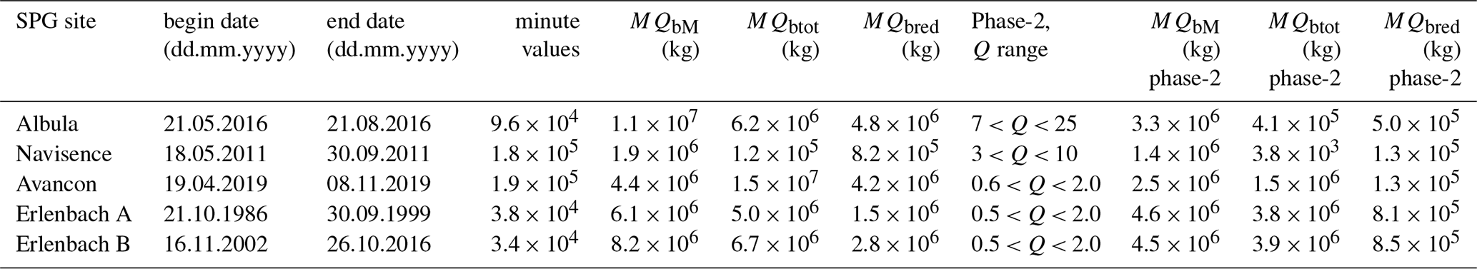 Table 4One-year-analysis of the temporal variations. Measured and calculated bedload masses for the Swiss streams and limiting discharges Q indicating phase-2-transport conditions. Bedload masses are given here for the entire observation period and for phase-2 flow periods only.
