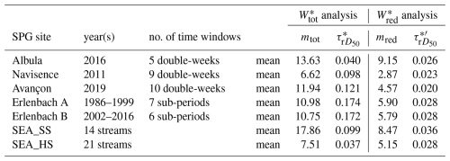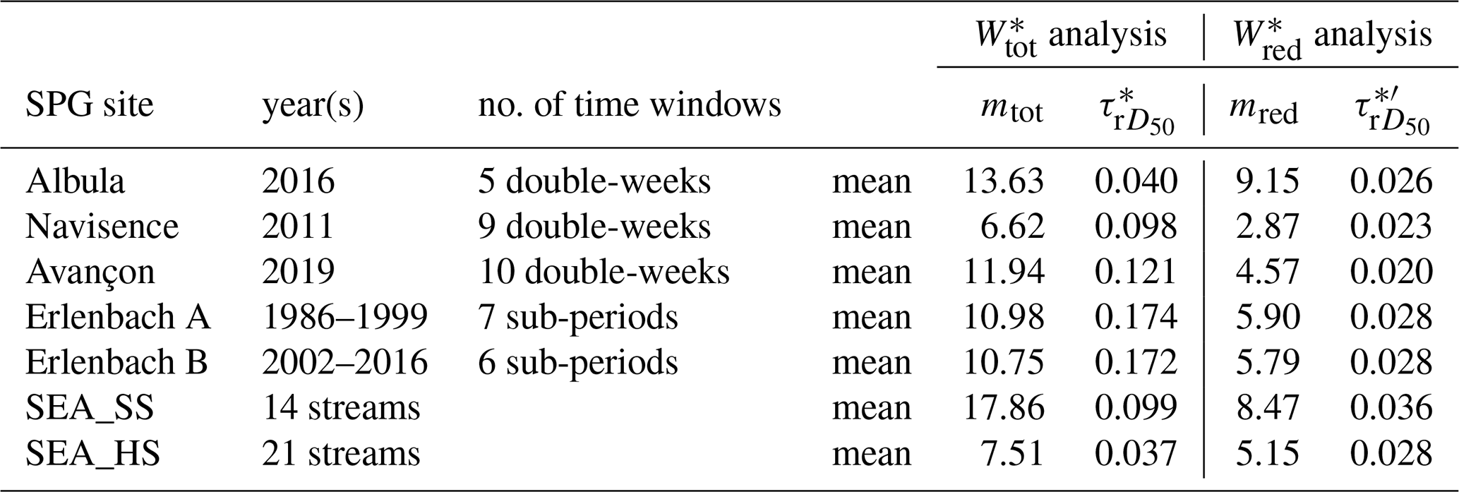 Table 5Mean values of exponents mtot, mred and of dimensionless reference shear stresses , derived from analysis of temporal variation of bedload transport relation for phase-2 transport conditions. A full list with all the individual values for each stream is given in the Supplement (Table S1). For comparison, mean values of the variables from a similar analysis in Schneider et al. (2015a) for date sets “SEA_SS” and “SEA_HS” are also given here.