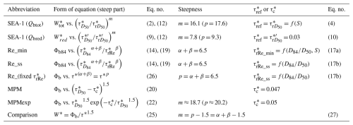 The MPM equation has often been applied in studies on gravel-bed rivers, and it is implemented in many numerical software codes to simulate bedload transport, typically for longer river reaches in 1D or also in also in selected river reaches in 2D simulations. Such software tools include HEC-RAS (Yavuz, 2025), Telemac (Villaret et al., 2013) and Basement (Vanzo et al., 2021). As can be seen in Fig. 2, the original MPM equation has an important drawback, in that the predicted transport rates in the vicinity of the critical Shields number almost encounter a step-function because the MPM relation (Eq. 20, hereafter referred to as original MPM) approaches a vertical line for dimensionless shear stresses slightly larger than but approaching the value. Therefore, it is much more sensitive in this shear stress range to the choice of the characteristic grain size D50, which is typically needed to estimate an appropriate or value, than the other equations. Four of the other predictive equations in Fig. 2 use a dimensionless reference shear stress, and the exponential form of the MPM equation (Eq. 22, hereafter referred to as MPMexp) results in a bedload transport relation that is qualitatively more similar to the SEA and the Recking equations than to the original MPM equation. For comparison, the mean steepness of Eq. (22) in Fig. 2c was calculated for bedload transport intensities in the range 1 × 10−7 < W∗ < 0.002 (the larger value corresponding to a dimensionless reference shear stress = 0.047) by approximating a power law, and this gives an equivalent exponent of m = 18.7. This value is rather close to the characteristic values for the SEA_SS data set, with a mean m = 17.9 (Table S1) and a median m = 16.1 which is used in Eq. (2a) to calculate or Qbtot. The value of m = 18.7 for = 0.047 for the MPMexp equation in the given range of W∗ values is included in Fig. 5 for comparison; this data point is positioned at the outer perimeter of the CH_TV and the SEA_SS data.