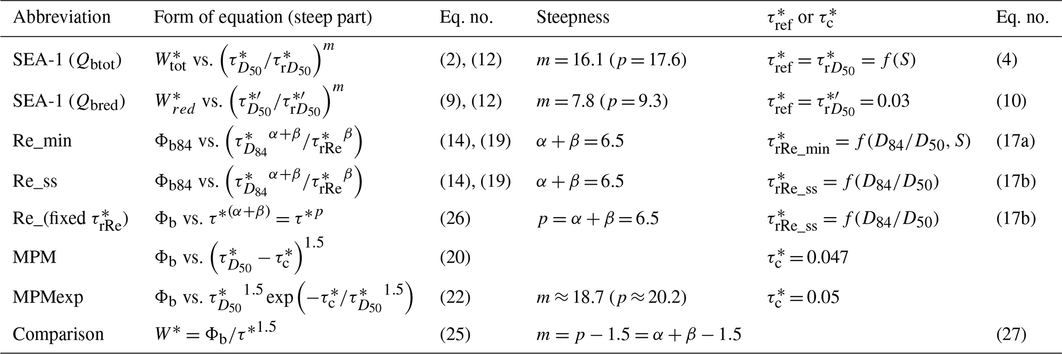 For further comparison with other transport equations introduced below, the steep part of the bedload transport relations (Eqs. 2a, 9a) is expressed in general form as: