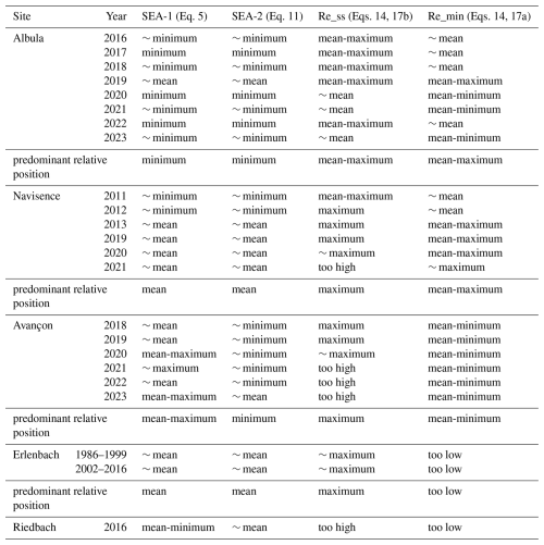 The quantitative results regarding the determined values of the exponents m and the dimensionless reference shear stresses are summarized in Table 5. The time-windows used to determine the trend lines (double weeks, sub-periods) involved durations of about 5000 to 20 000 min. The Supplement provides a full list of all the individual values for each stream (Table S1). In this quantitative analysis, not all time-windows (double week periods) shown in Fig. 4 yielded plausible results. This concerns the following number of excluded double week periods: 2 (out of 7) for the Albula, 1 (out of 10) for the Navisence, and 3 (out of 13) for the Avançon. All 13 sub-periods were used for the Erlenbach.