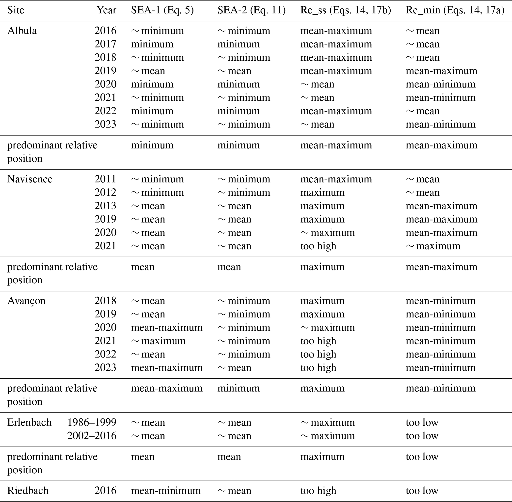 The bedload transport measurements at the five Swiss SPG-sites in Table 1 are compared in Fig. 3 to four different bedload transport equations described in chapter 2 and summarized in Table B1 (Appendix B). The four bedload transport equations applied in Fig. 3 are from Schneider et al. (2015a), namely SEA-1 (Qbtot, Eq. 5) and SEA-2 (Qbred, Eq. 11), and the equation of Recking et al. (2016) for β = 4 (Eq. 14) using two different estimates of the reference shear stress, namely (Eqs. 17a, 18a, QbRe_min) and (Eqs. 17b, 18b, QbRe_ss). Summary values characterizing the annual bedload transport for four streams and for the selected year are given in Table 4.