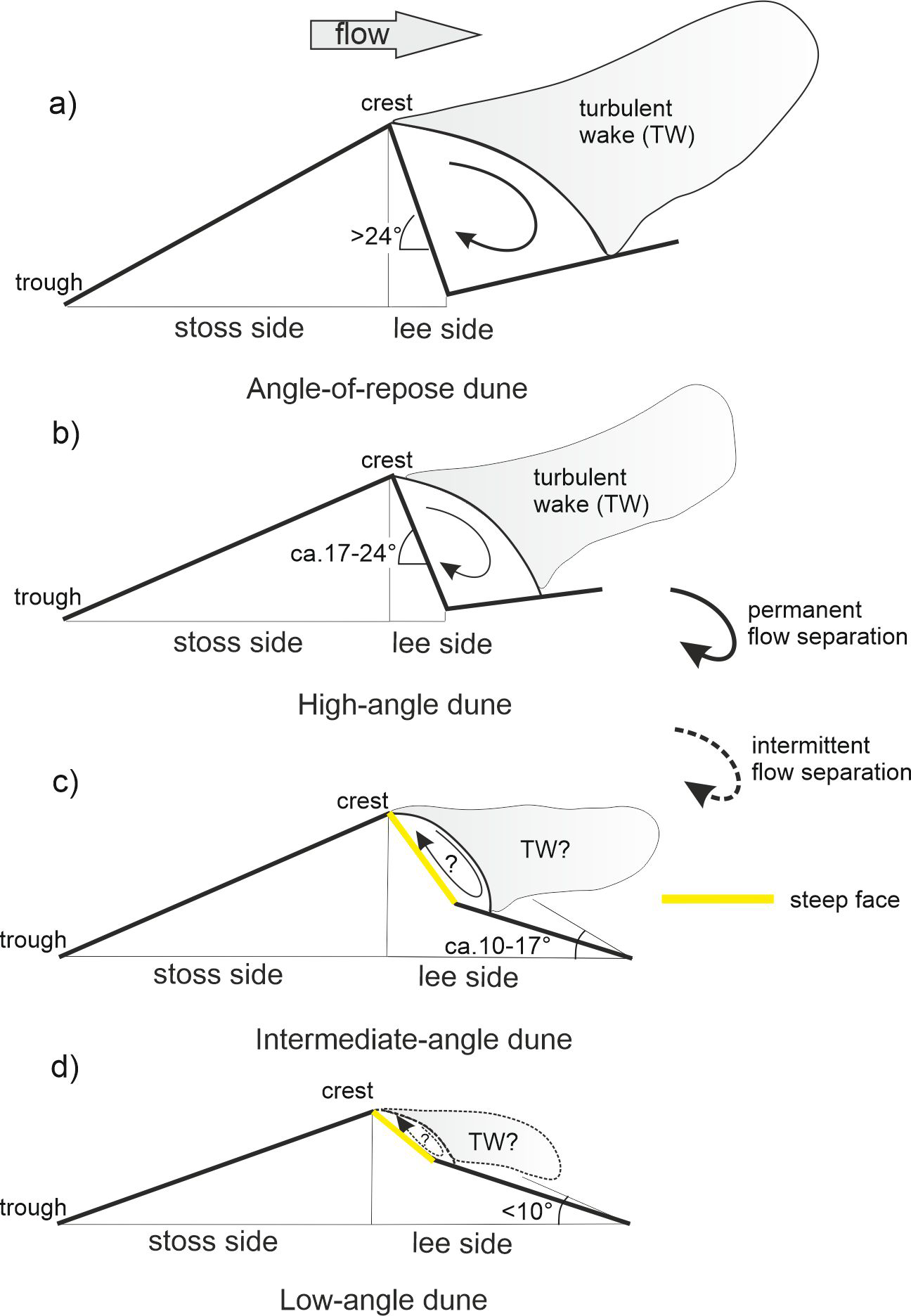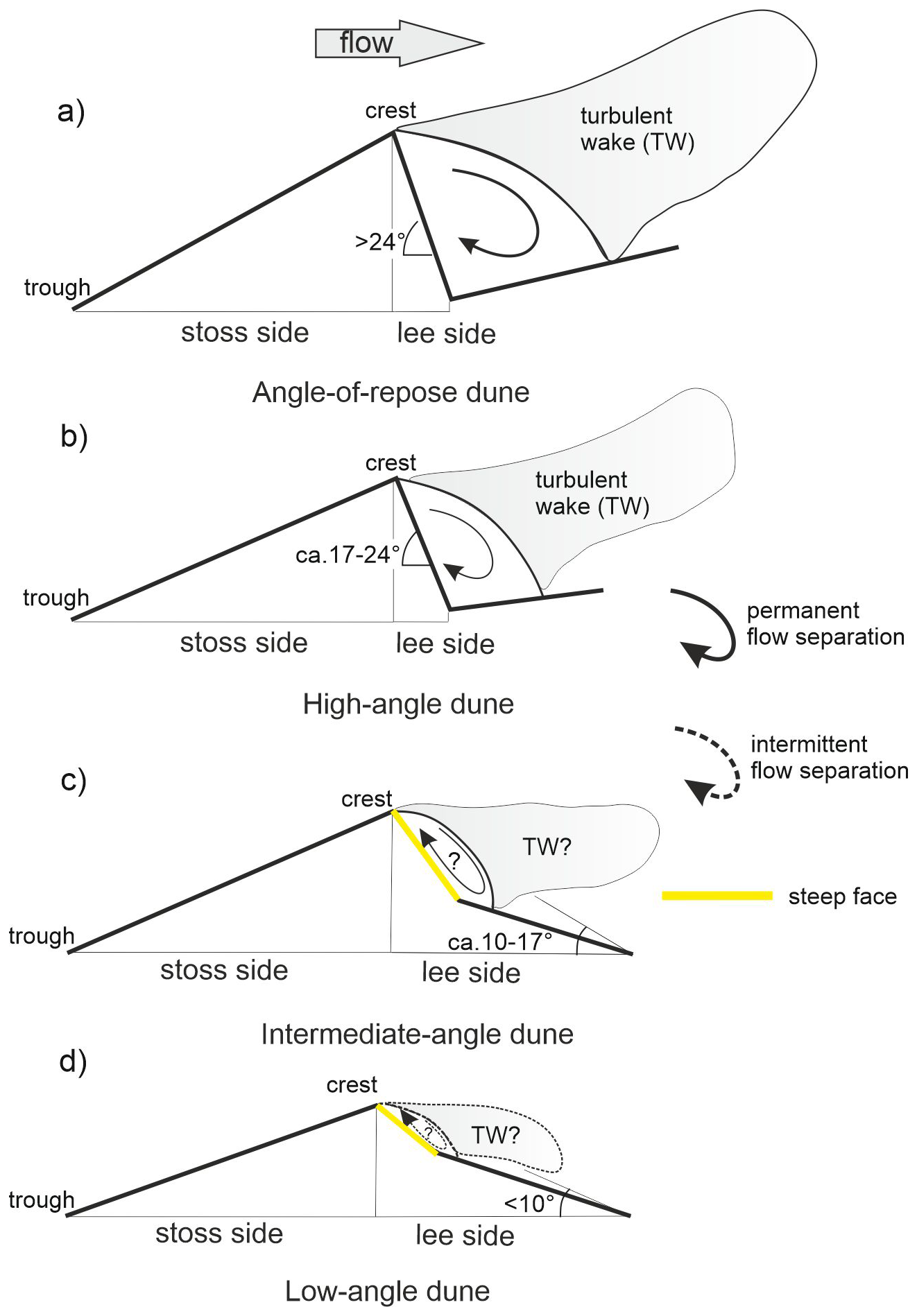 Intermediate-angle dunes (Fig. 1c) rarely have a permanent flow separation but are likely to possess an intermittent flow separation (Kostaschuk and Villard, 1996; Roden, 1998; Best and Kostaschuk, 2002; Sukhodolov et al., 2006; Lefebvre and Cisneros, 2023). Turbulence is weaker than over high-angle dunes, but will usually display a distinct wake above the trough (Lefebvre and Cisneros, 2023). For low-angle dunes (Fig. 1d), several studies report the absence of permanent flow separation and some intermittent flow separation may be present (Kostaschuk and Villard, 1996; Roden, 1998; Carling et al., 2000; Best and Kostaschuk, 2002; Sukhodolov et al., 2006; Kwoll et al., 2016). Turbulence over low-angle dunes is expected to be weaker than that of high-angle dunes and might be even similar to that over a flatbed condition (Kline et al., 1967). While these earlier findings highlight the importance of lee side geometry, the conditions under which flow separation transitions between nonexistent, intermittent and permanent separation and how these transitions reorganise turbulence are still not fully resolved for intermediate to low-angle dunes.
