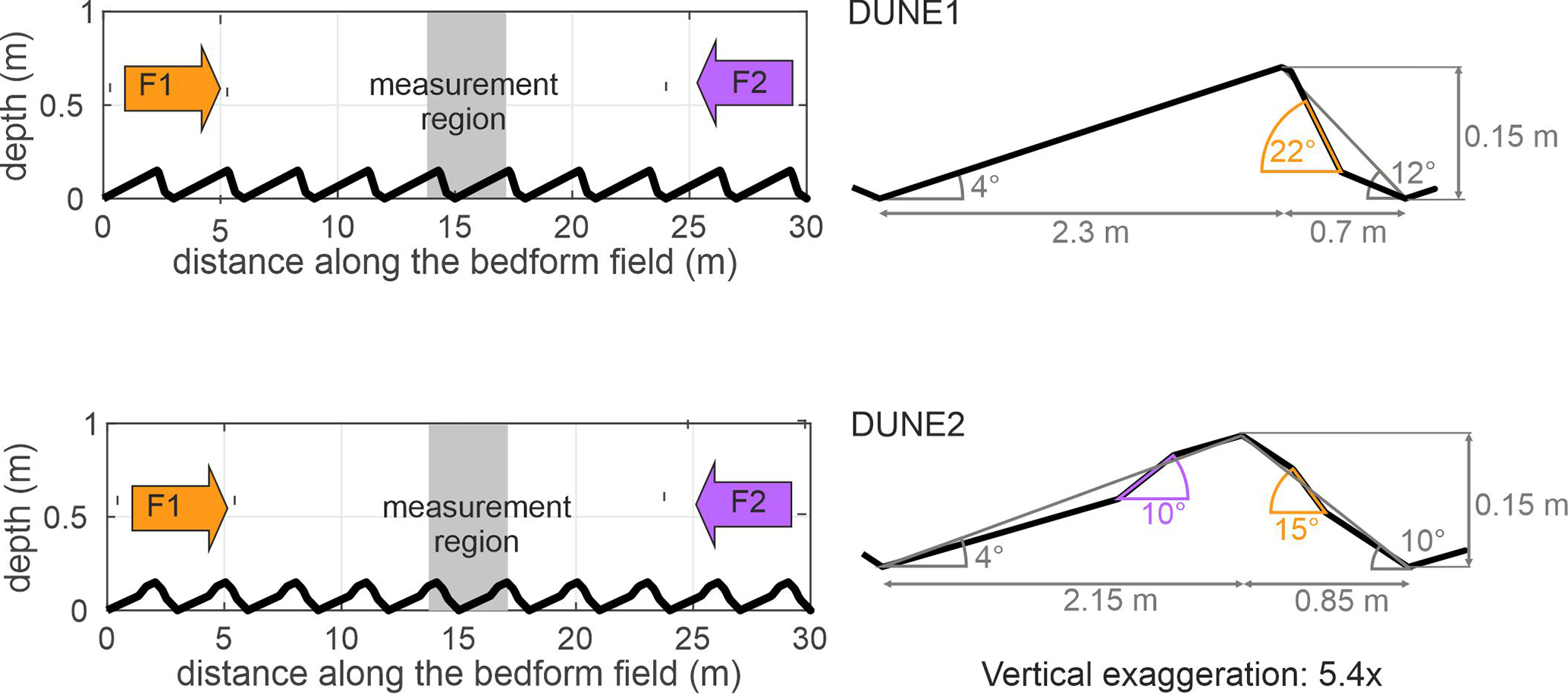 The two laboratory dunes and the setup inside the recirculating flume are shown in Fig. 4. The fixed dunes were made from concrete and were fine-sandblasted to provide a natural grain roughness. Measurements were conducted in two opposite flow directions (i.e., F1 and F2 flows) for the two laboratory dunes. For each measurement, the mean water depth, dune length, dune height and flow velocity were kept constant to allow comparison between measurements. In order to measure flow properties in equilibrium with the dune morphology, a field of 10 identical dunes were deployed at the centreline of the straight channel section of the flume, covering a total distance of 30 m, and measurement region for each flow direction was above the 5th dune (Fig. 4).