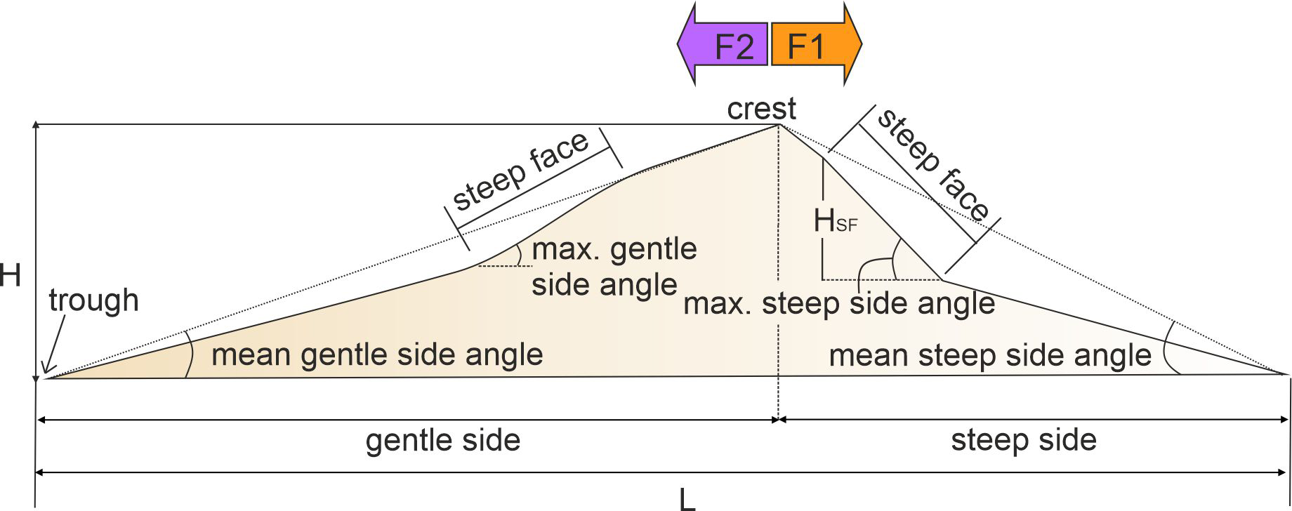 Figure 5Schematic diagram of tidal dune morphology. H is the bedform height, HSF is the steep face height, L is the bedform length, F1 refers to the flow that is aligned with the dune asymmetry (i.e., the flow is directed from the gentle stoss to the steep lee slope) and F2 refers to the flow that is opposing the dune asymmetry (i.e., the flow is directed from the steep stoss to the gentle lee slope).