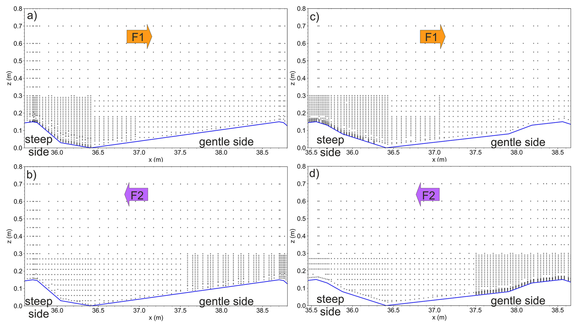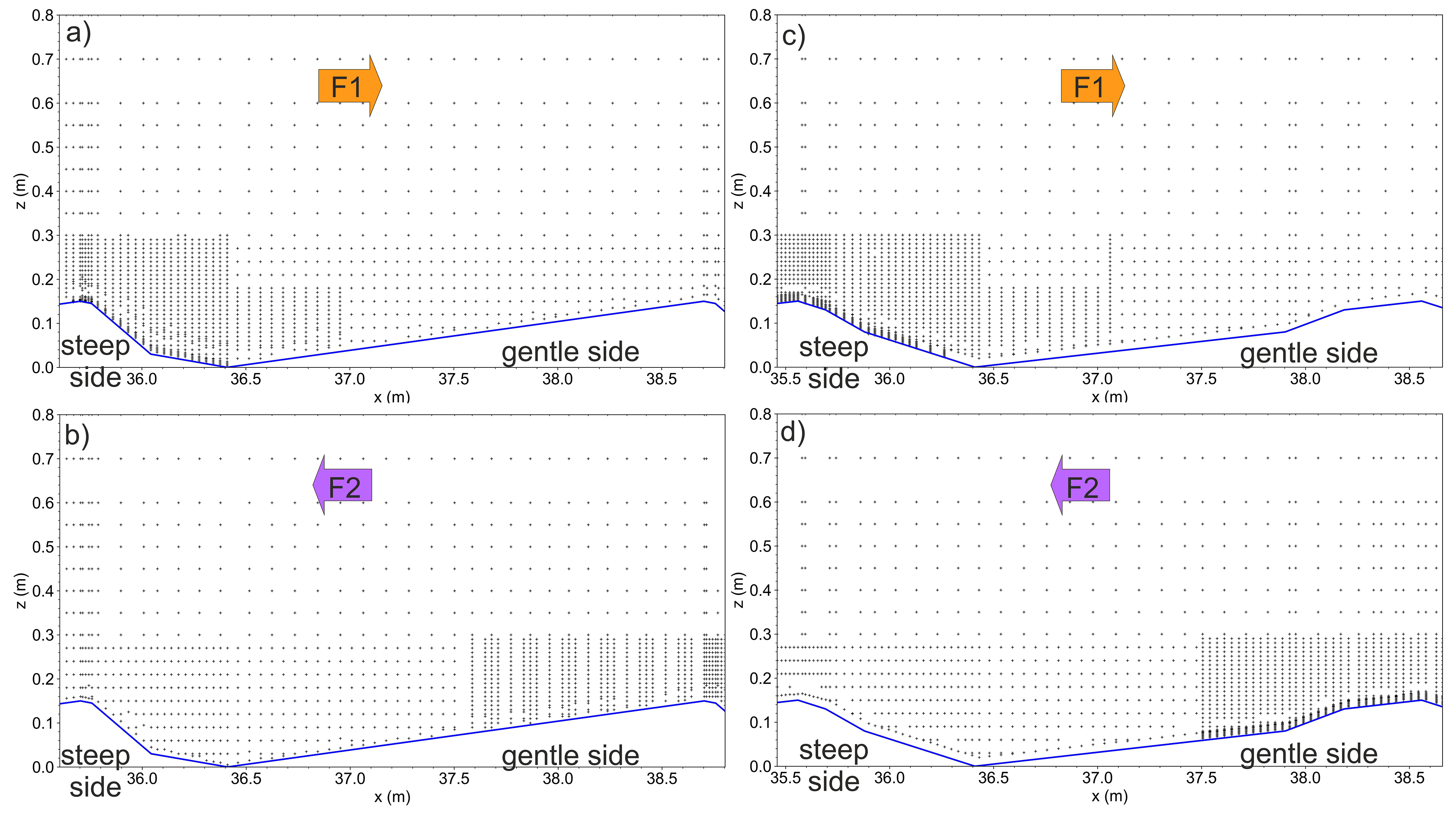 Figure 6ADV point measurement layout. (a) DUNE1_F1, (b) DUNE1_F2, (c) DUNE2_F1, (d) DUNE2_F2. F1: flow aligned with dune asymmetry; F2: flow opposed to dune asymmetry.