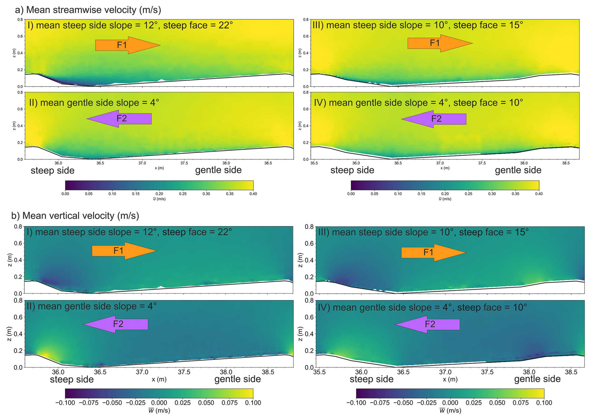 Figure 8Time-averaged flow fields. (I) DUNE1_F1, (II) DUNE1_F2, (III) DUNE2_F1, (IV) DUNE2_F2.
