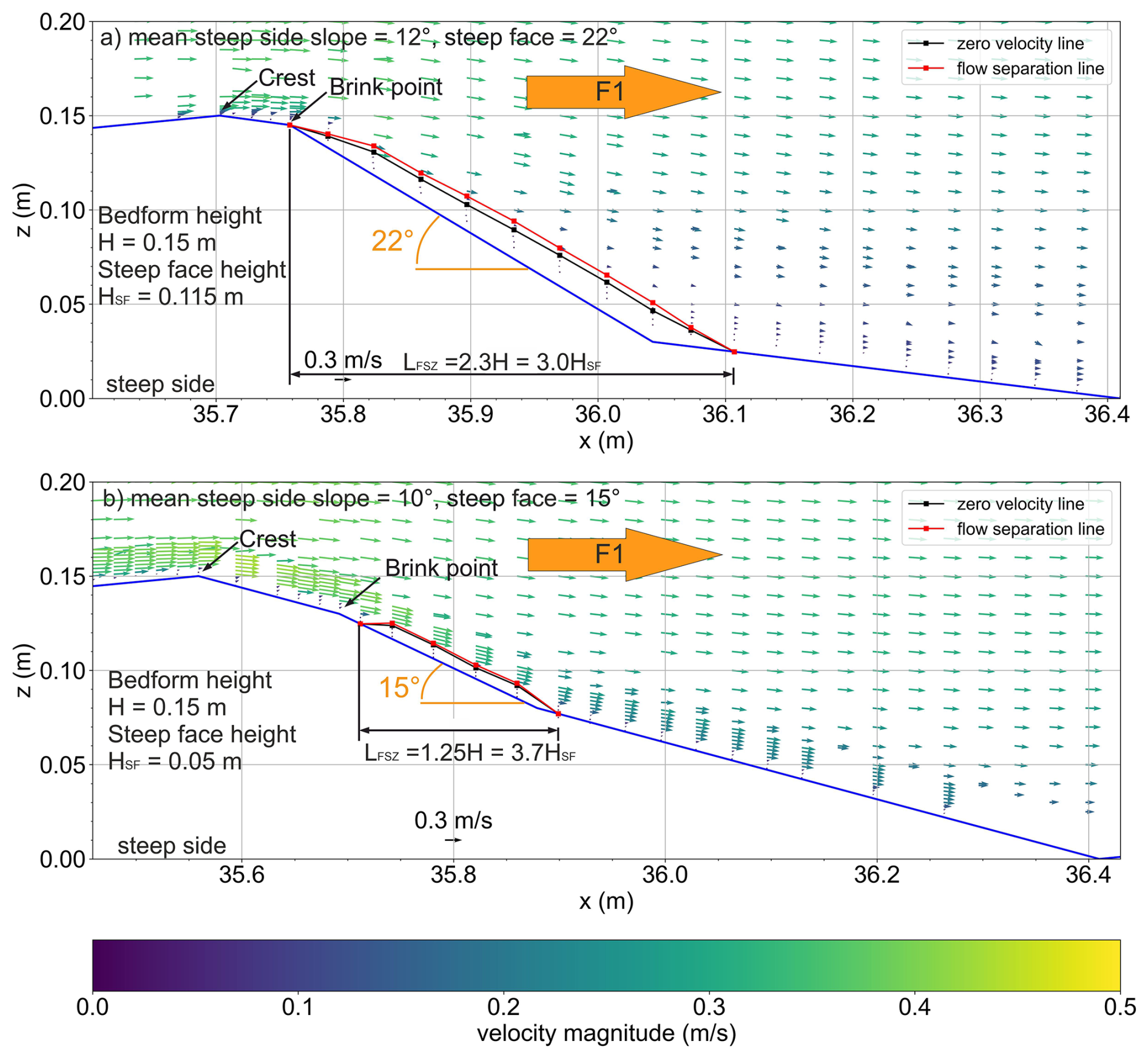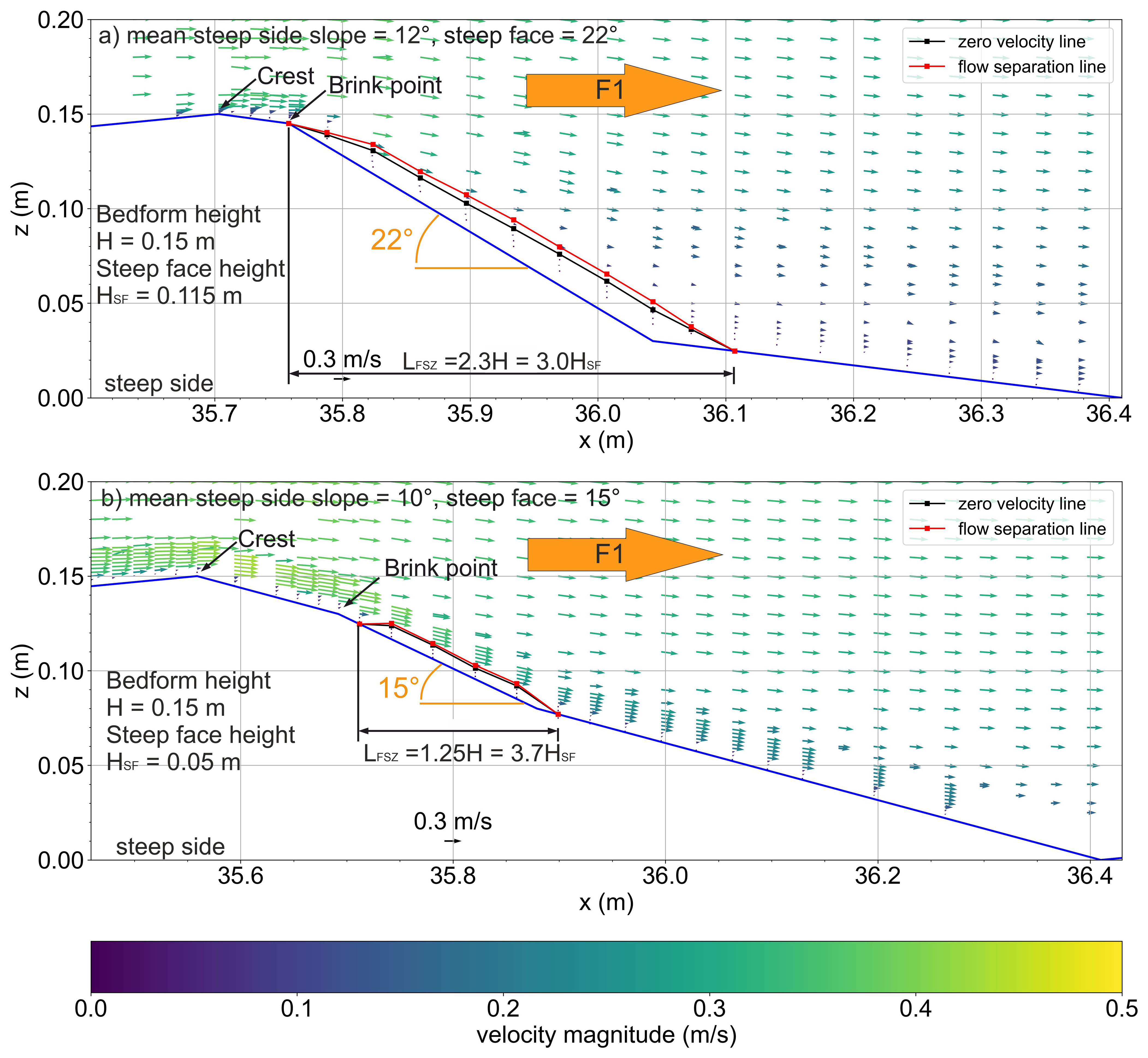 A permanent flow separation zone can be observed very close to the dune surface for both dunes over their steep faces, when the flow is directed from the gentle stoss to the steep lee slope (F1 flow) (Fig. 9). Both flow separations start to develop at or shortly after the brink point, which marks the beginning of the steep face, and are extending over the steep lee side of the dune. Although both dunes show the presence of flow separation, their sizes are different. For DUNE1_F1, the flow separation length is LFSZ=2.3H or 3.0HSF. The maximum thickness is ThFSZ=0.14H or 0.18HSF. For DUNE2_F1, the flow separation length and thickness are much shorter and thinner than that of DUNE1_F1 with dimensions of LFSZ=1.25H or 3.74HSF and ThFSZ=0.06H or 0.17HSF. Note that both dunes have the same bedform height but different steep face heights.