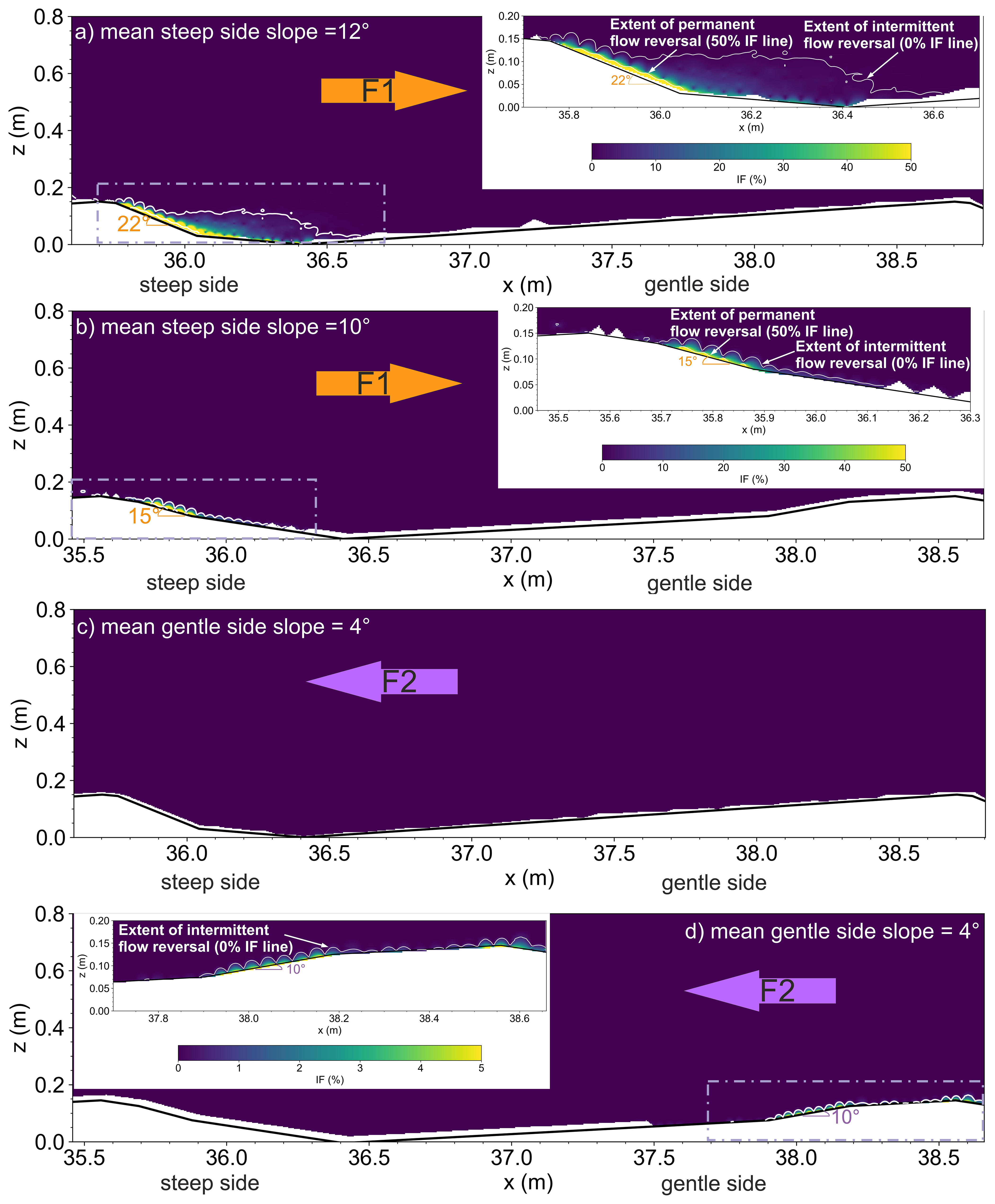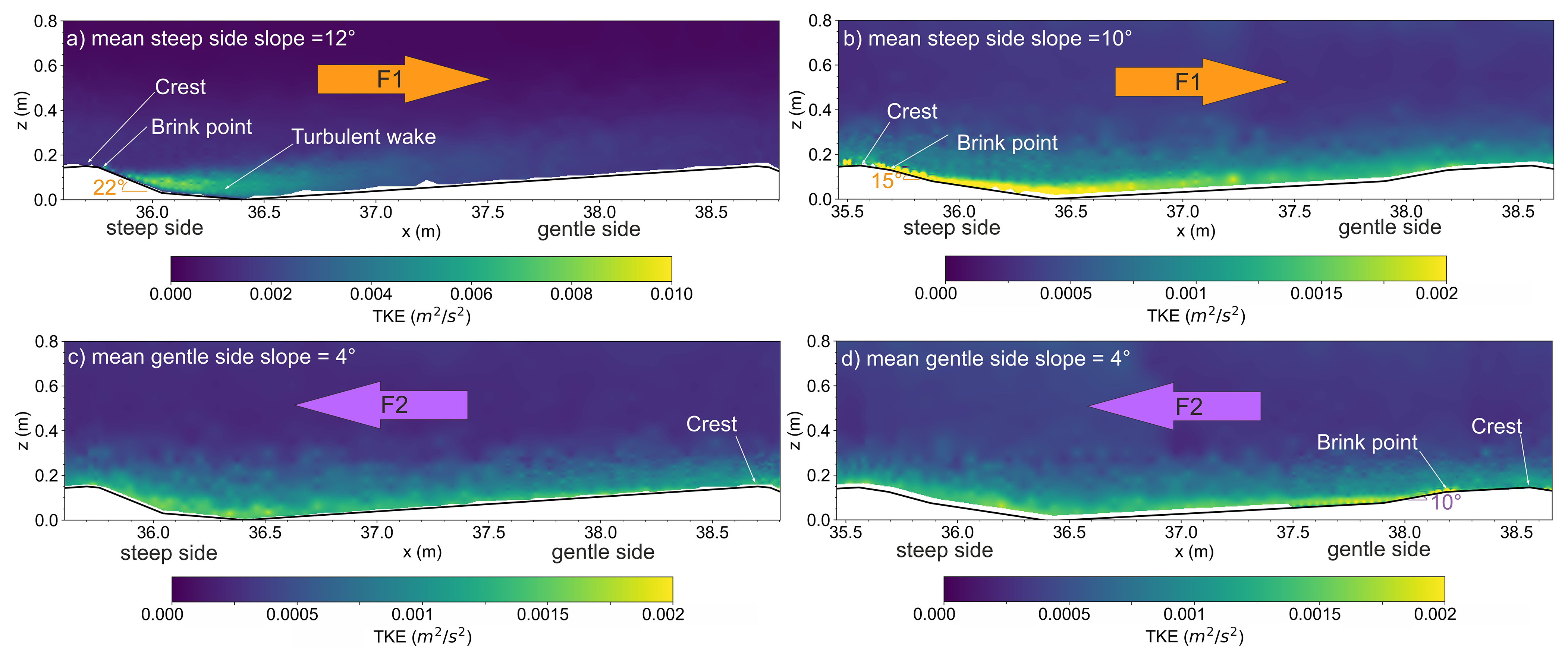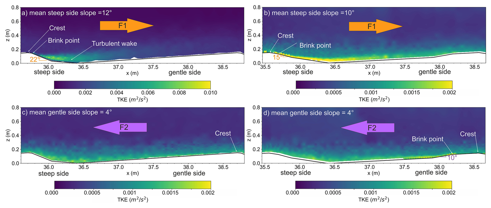 When the flow is now directed from the steep stoss to the gentle lee slope of the dune (F2 flow), a similar trend of TKE is observed for both dunes, DUNE1_F2 and DUNE2_F2 (Fig. 12c and d). High TKE is concentrated in the near-bottom region of the flow with no appreciable wake structure. The TKE in the near-bottom flow region diminishes further when there is no steep face present at all (Fig. 12c). Interestingly for DUNE2_F2 (Fig. 12d), a slightly elevated TKE can be detected within the short steep portion (ca. x=38–38.5 m) of the gentle lee slope of the dune but the extent is still limited in the very near-bottom region of the flow.