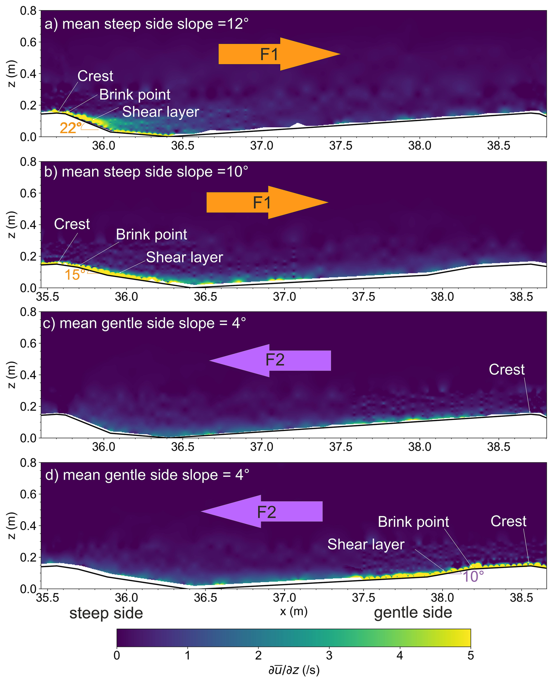 Over DUNE1 and when the flow is directed from the gentle stoss to the steep lee slope (i.e., DUNE1_F1), a large and wide horizontal velocity gradient, u/z, is observed to develop past the brink point and dissipate downstream of the steep lee side and over the gentle stoss side of the next dune (Fig. 11a). The thickest portion of the velocity gradient can be found at the steep face (ca. x=36.0 m). This steep velocity gradient indicates the presence of a shear layer and significant vorticity. For DUNE2_F1, a thin shear layer, almost attached to the bed and with a diffused-like structure, is observed (Fig. 11b).