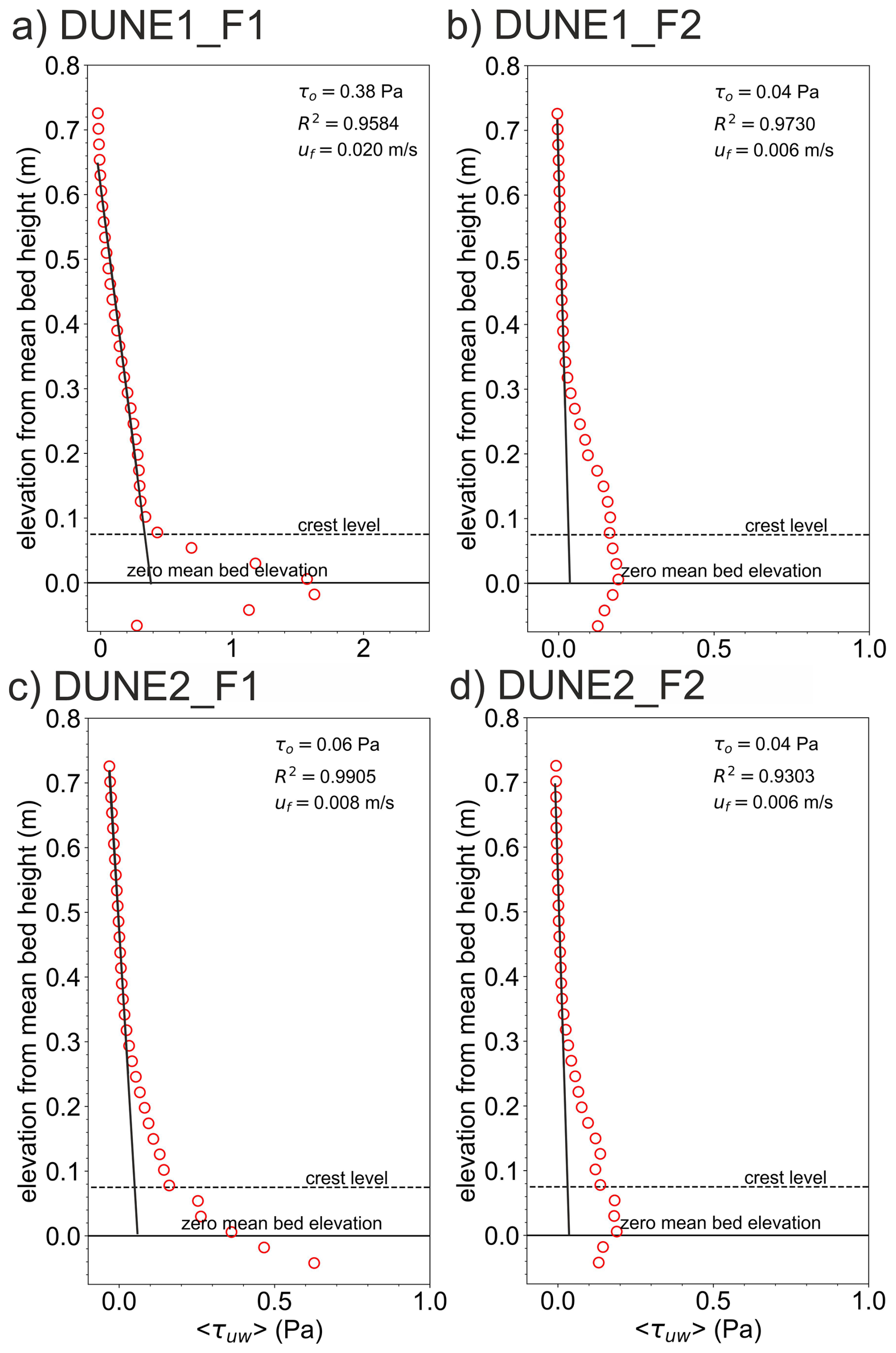 The spatially-averaged Reynolds stress profile can also provide a direct estimate of the total bottom shear stress as pointed out in previous studies (Nelson et al., 1993; Bennett and Best, 1995; Nikora et al., 2001; McLean et al., 2008; Kwoll et al., 2016) by performing a regression analysis through the linear segment of the profile and projecting it downwards towards the zero mean bed elevation. The bed shear stress estimation shows a high coefficient of determination for all the linear fits (Fig. 13). For DUNE1_F1, the linear fit is done above z=0.2 m and from this linear fit, the estimated total bottom shear stress, τ0, is 0.38 Pa. For DUNE2_F1, the linear fit is above z=0.34 m with estimated τ0 of 0.06 Pa.