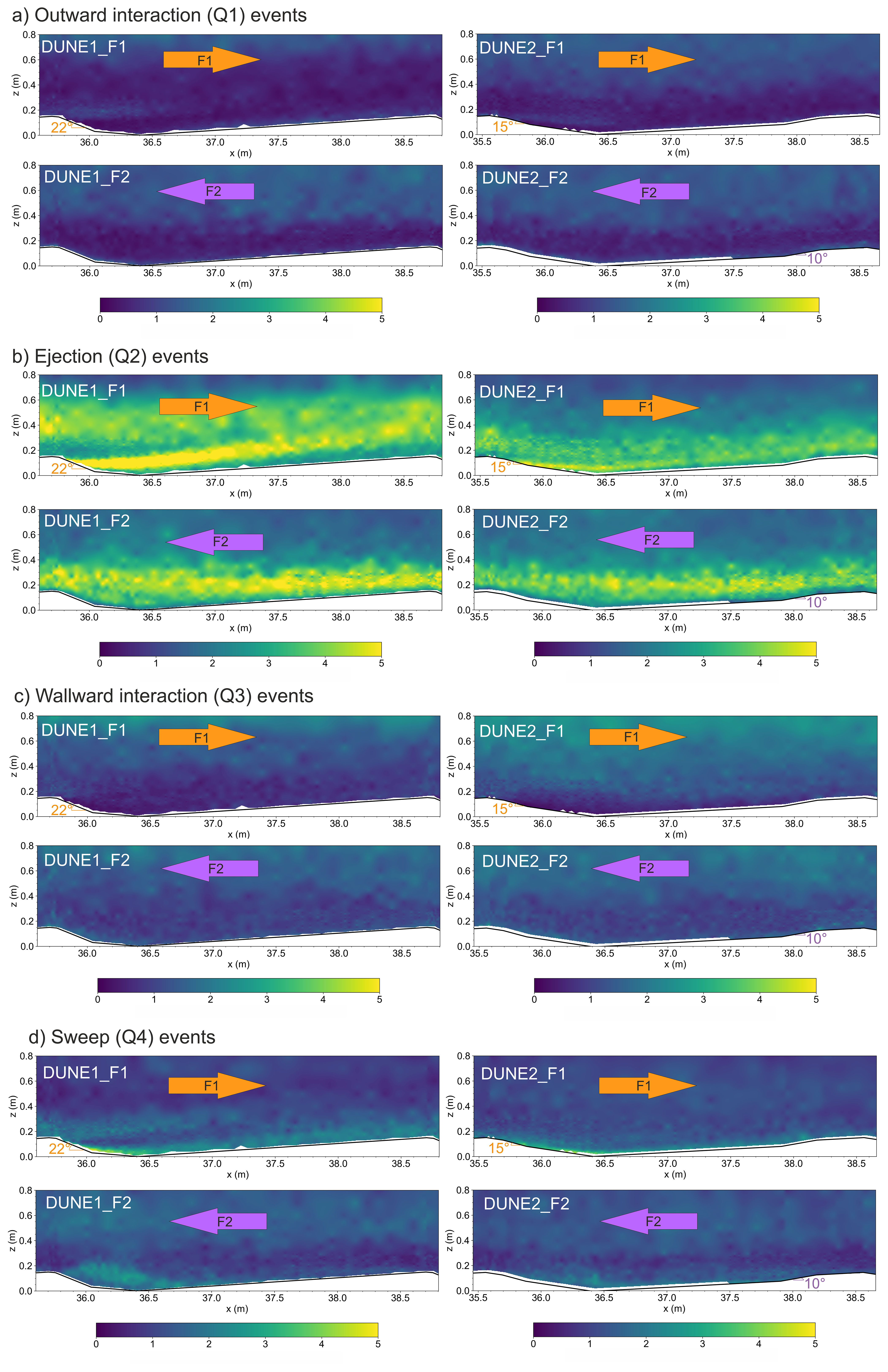 6. Quadrant analysis results demonstrate the occurrence of large-scale turbulence even for intermediate- and low-angle dunes through the presence of strong and frequent ejection and sweep events. Identification and accounting for large-scale turbulence structure in sediment transport are important as they act as principal drivers of sediment suspension and vertical mixing processes found in natural flow environments.