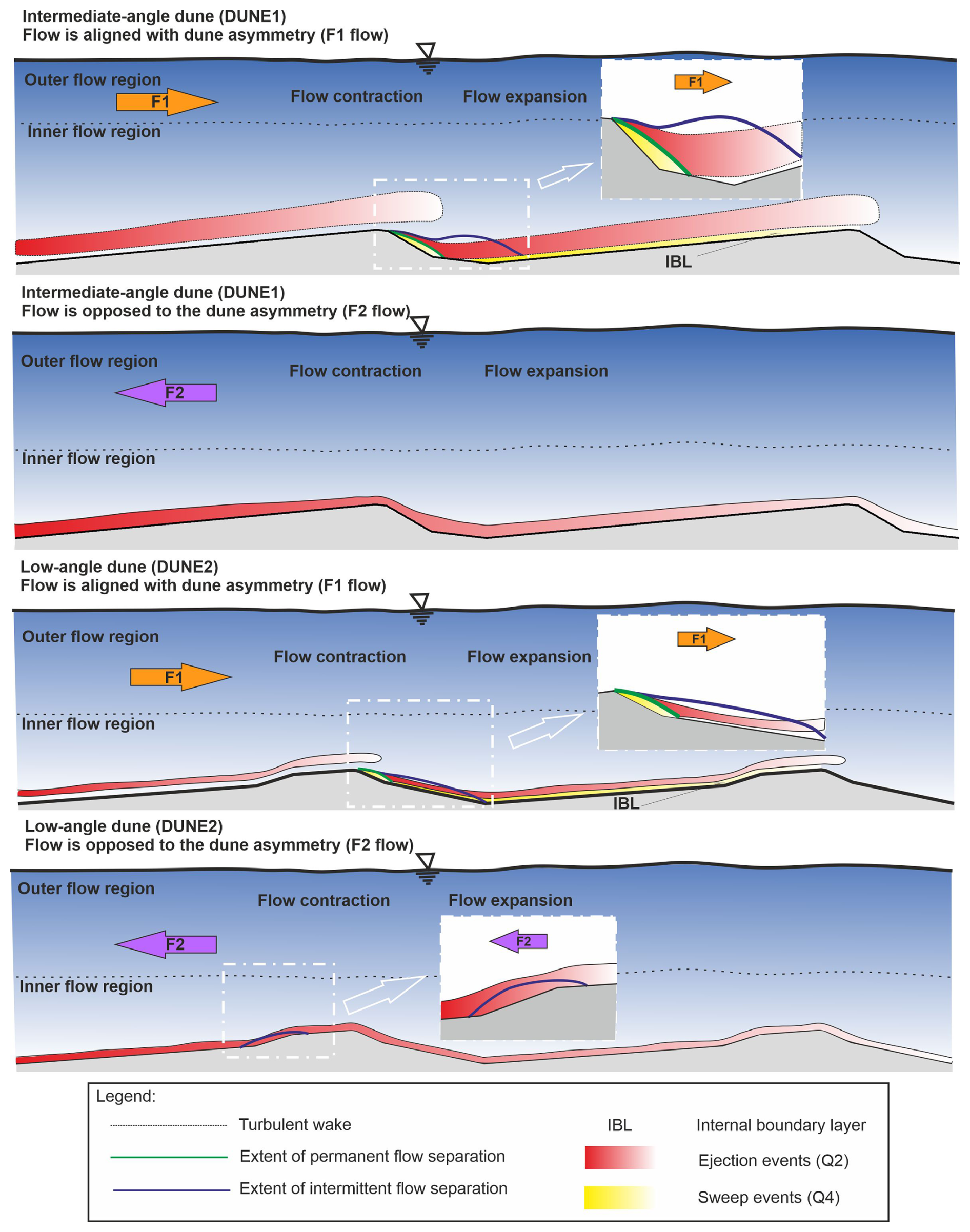 1. Permanent and intermittent flow separation zones exist for the two tested dune configurations. The properties of the flow separation are directly influenced by the presence and slope of the steep face and mean lee side angle. Specifically, we are able to quantify in detail the shape and extent of both permanent and intermittent flow separations for both intermediate- and low-angle dunes.