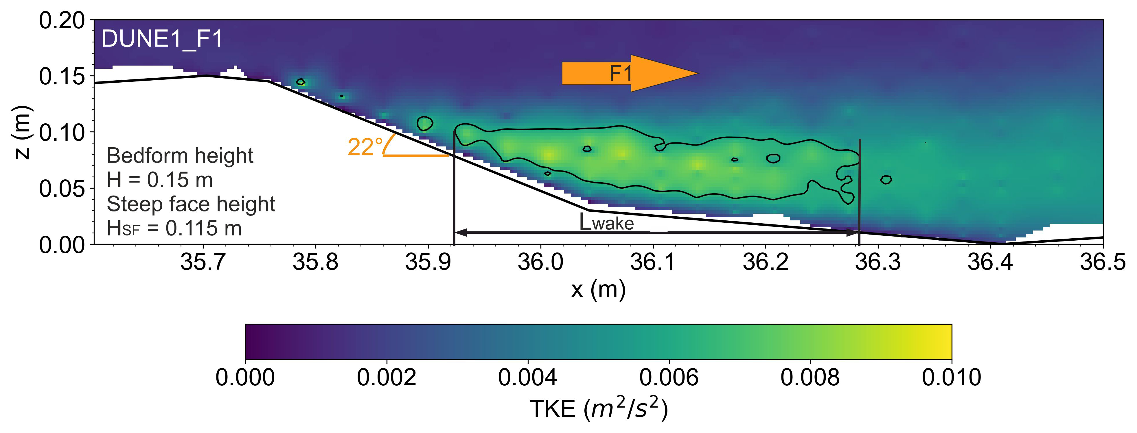 5. No defined wake structure is observed over the tested low-angle dune. Instead, high TKE is concentrated in the very near-bottom region of the flow with a structure similar to a diffuse pattern observed over flatbed conditions.