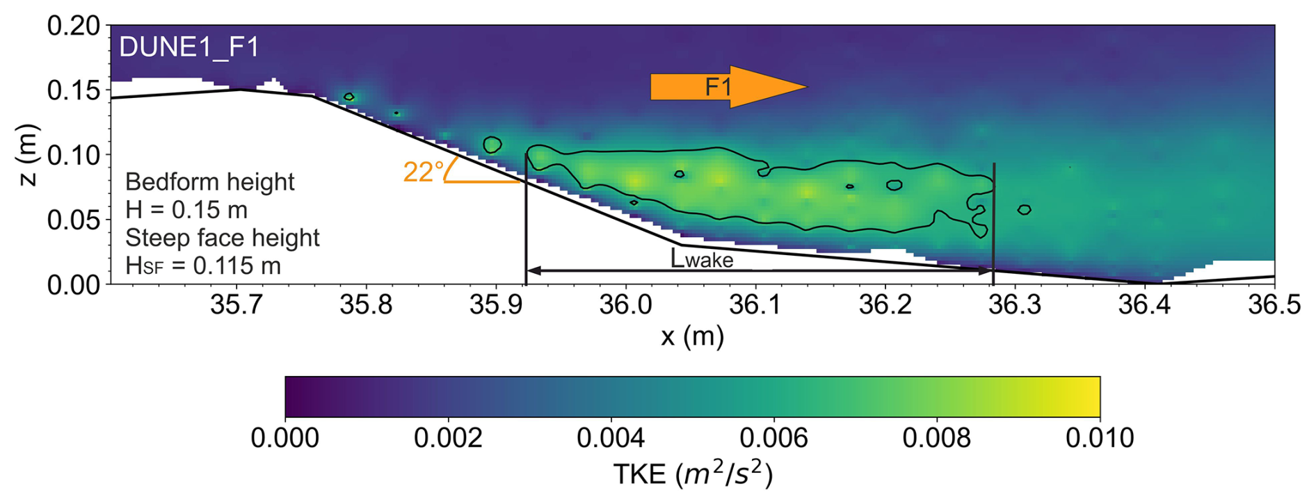 For DUNE1_F1, a well-defined turbulent wake can be seen developing just downstream of the brink point above the steep face (Fig. 12a). It propagates downstream of the steep side until it dissipates over the gentle stoss side of the next dune. The strongest portion of the wake with maximum TKE of 0.0089 m2 s−2 is observed immediately downstream of the steep face (ca. x=36.0–36.1 m). For DUNE2_F1, the turbulence is further reduced with no defined wake structure and a more diffuse pattern can be detected (Fig. 12b). High TKE is concentrated within the immediate vicinity of the bed and diminishes towards the upper portion of the water column. Although not as strong as that of DUNE1_F1, high TKE occurs within the trough and the immediate downstream portion of the gentle stoss side.