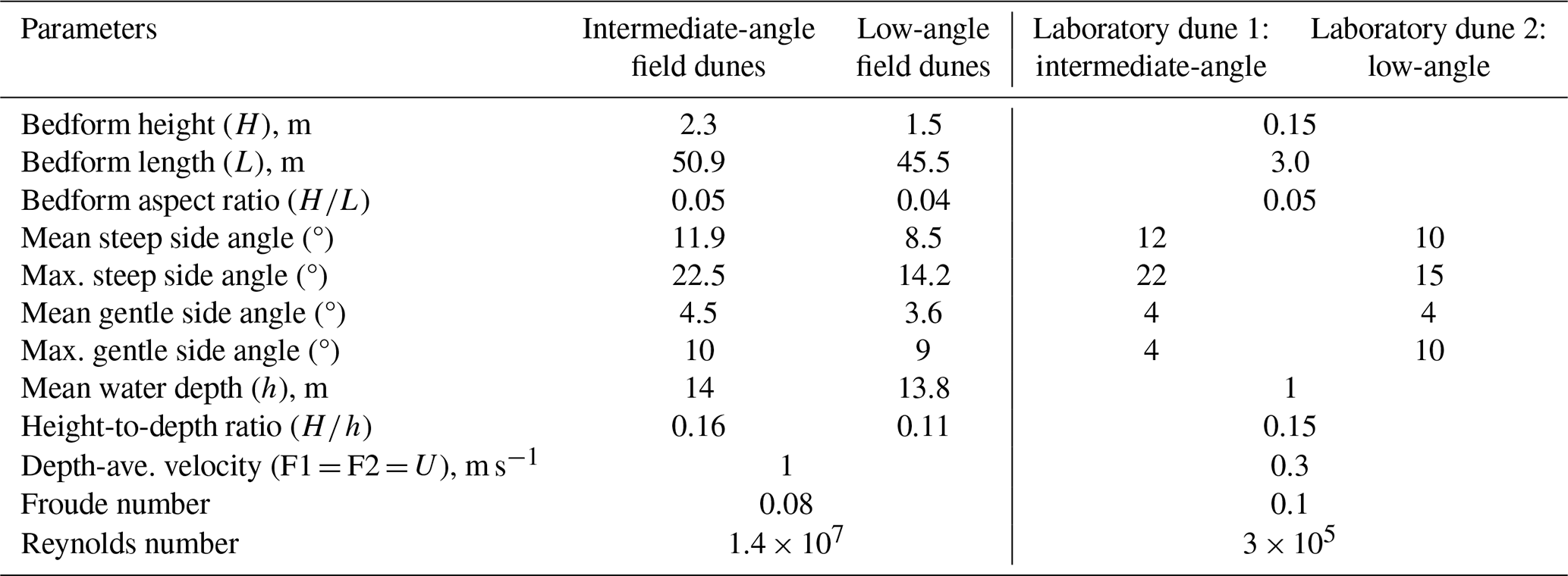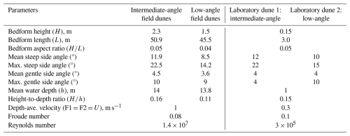 Table 1Dune morphology and hydrodynamic conditions between field and laboratory dunes.